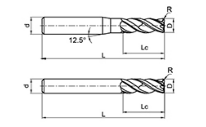 | Nej. | Diameter D | R Vinkel R | Flöjtlängd Lc | Total längd L | Shank Dia d | Bladräkning F |