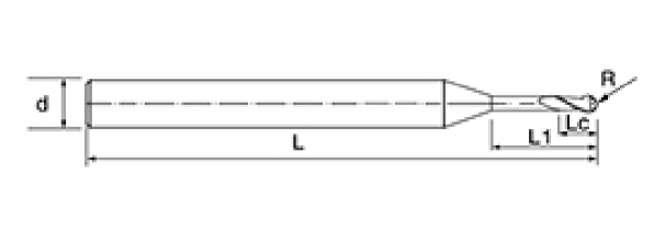 | Nej. | Diameter D | R Vinkel R | Flöjtlängd Lc | Effektiv längd L1 | Total längd L | Shank Dia d | Bladräkning F |