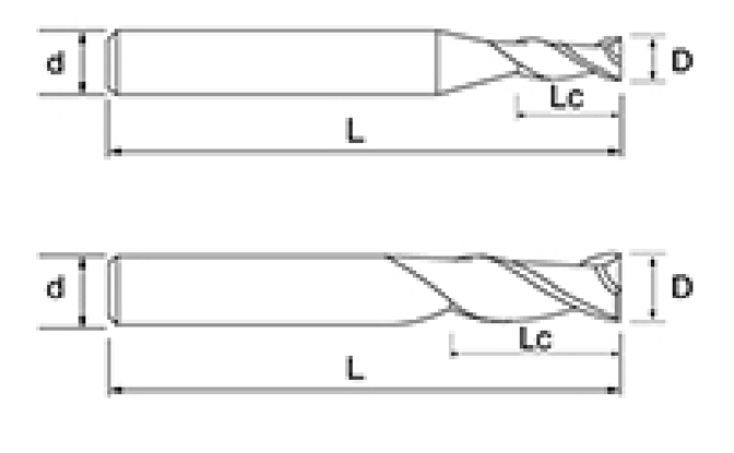 | Nej. | Diameter D | Flöjtlängd Lc | Total längd L | Shank Dia d | Bladräkning F |