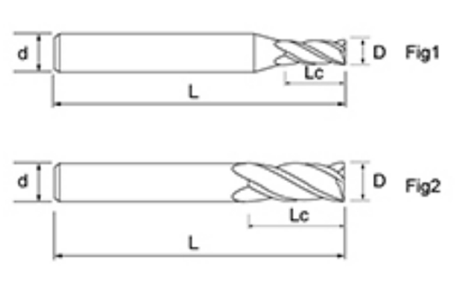 | Nej. | Diameter D | Flöjtlängd Lc | Total längd L | Shank Dia d | Bladräkning F |