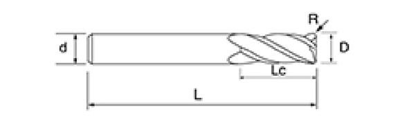 | Nej. | Diameter D | R Vinkel R | Flöjtlängd Lc | Total längd L | Shank Dia d | Bladräkning F |