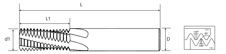 | Pitch | Grova tänder UNC | Fina tänder UNF | Ultrafina tänder UNEF | Bladets diameter d1 | Effektiv bladlängd L1 | Handtagsdiameter D | Total längd L | Bladräkning | Nedre hålets diameter |