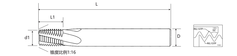 Denna fräs är lämplig för en mängd olika material, inklusive kolstål, legerat stål, rostfritt stål, gjutjärn, icke-järnmetaller och plaster. Tillgänglig i flera specifikationer från RC1/16 till 2", ger den flexibilitet för att tillgodose olika applikationsbehov. Verktygets design möjliggör anpassningsbara parameterkonfigurationer, inklusive skärdiameter d1, effektiv skärlängd L1, skaftdiameter D och total längd L, vilket optimerar bearbetningseffektivitet och gängkvalitet.